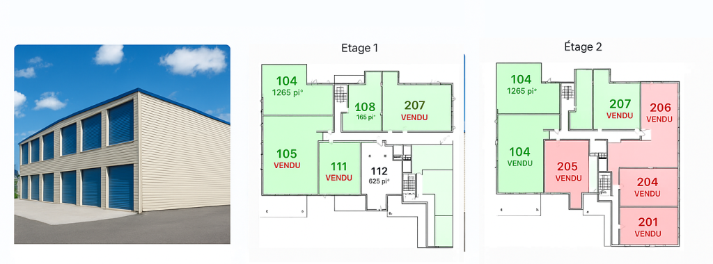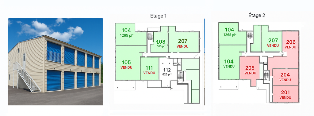 Répartis sur 2 étages, nos installations totalisent plus de 350 unités (202 et 150 unités), conçues pour s’adapter à tous vos besoins d’entreposage résidentiels ou commerciaux, avec des formats variés et une flexibilité optimale.